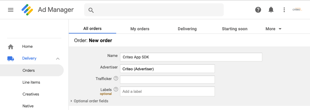 Go to Delivery > All orders and click on New Order to create a new Order for Criteo App SDK campaign.