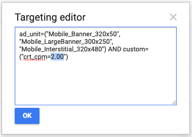 For each price granularity, your line items should have matching CPM rate and keyword targeting. For example, a $1 line item would have a $1 CPM rate as well as 1.00 keyword targeting. Please note that keyword targeting is always defined in two decimal places.