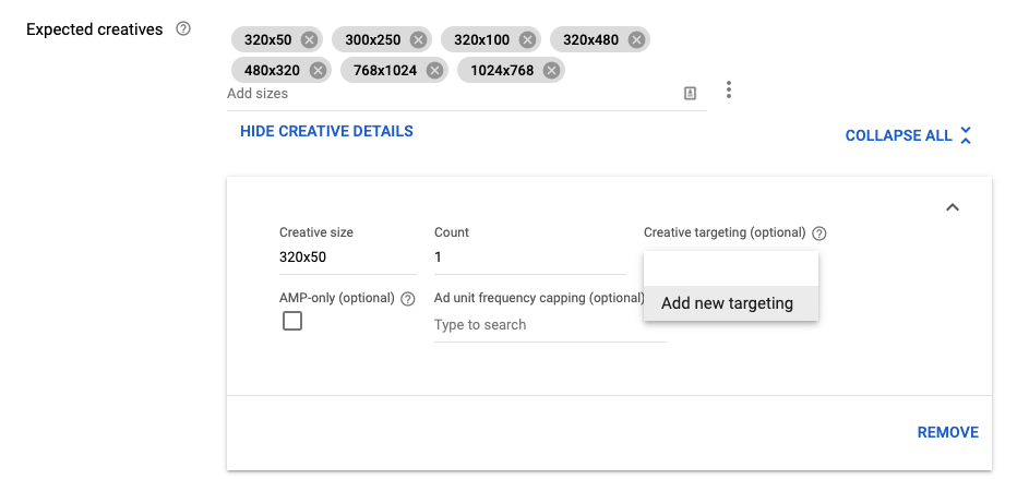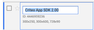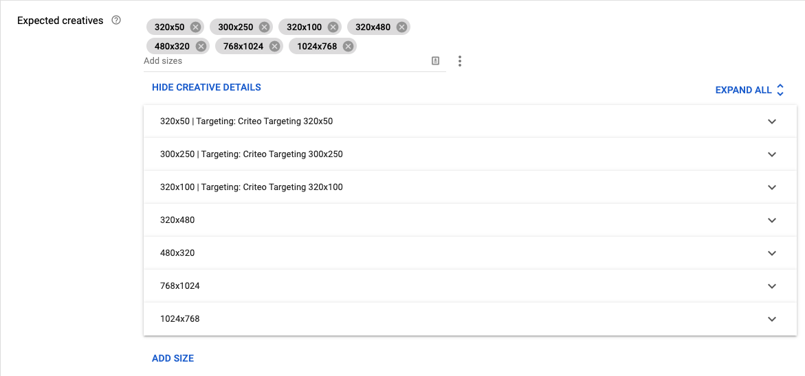 Below the list of sizes, click on Show Creative Details, and on the Creative Targeting section, select Add new targeting. As of Criteo SDK v3.6.0 creative targeting is required for each Banner sizes.
