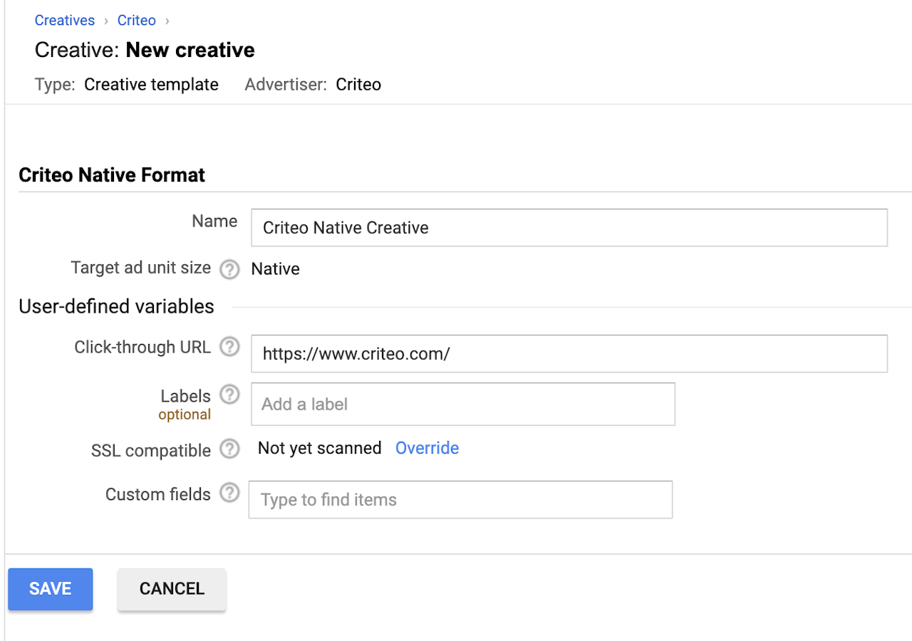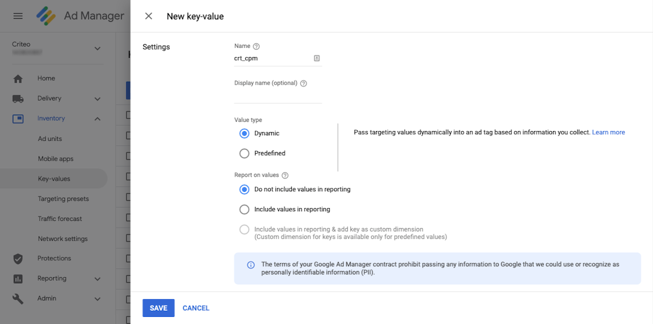 You will then be able to use crt_cpm to let Criteo participates in your bidding ad server, and crt_displayUrl to render the banner when Criteo wins the auction. In a standard ad server setup, these 2 values are set as keyvalue/keyword targeting.
