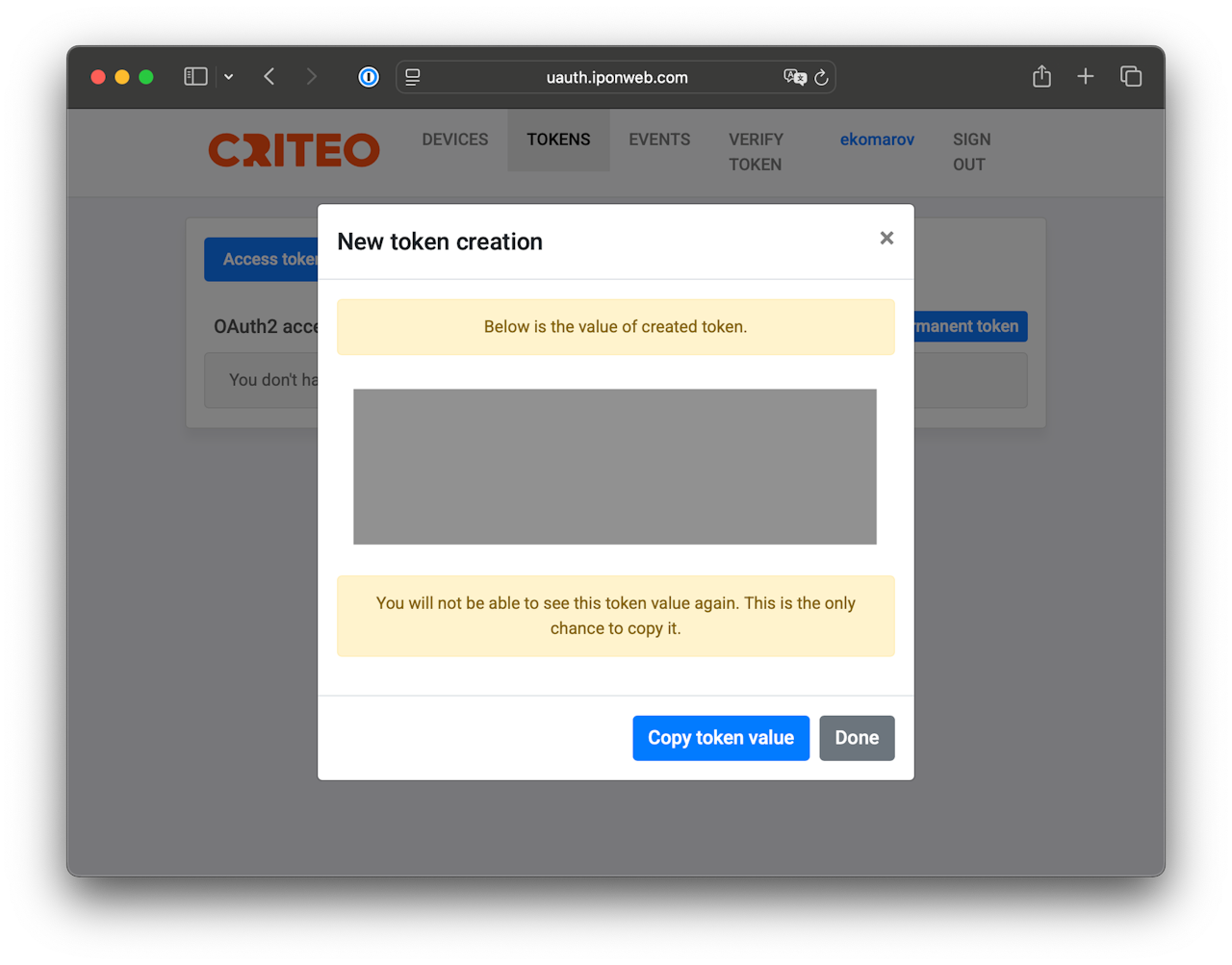 Press “Copy token value” and save it somewhere secure and accessible. The token value will only appear here once; if you lose your token or otherwise exit the window before you have saved it, you can start the process over again to access a new replacement token.