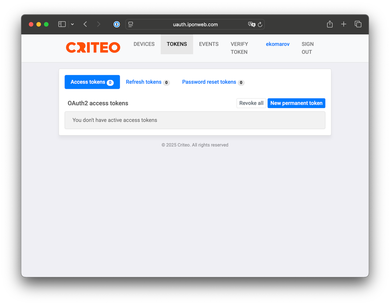 After logging in, go to the “Tokens” section. If this is your first time getting a token, the list will be empty.