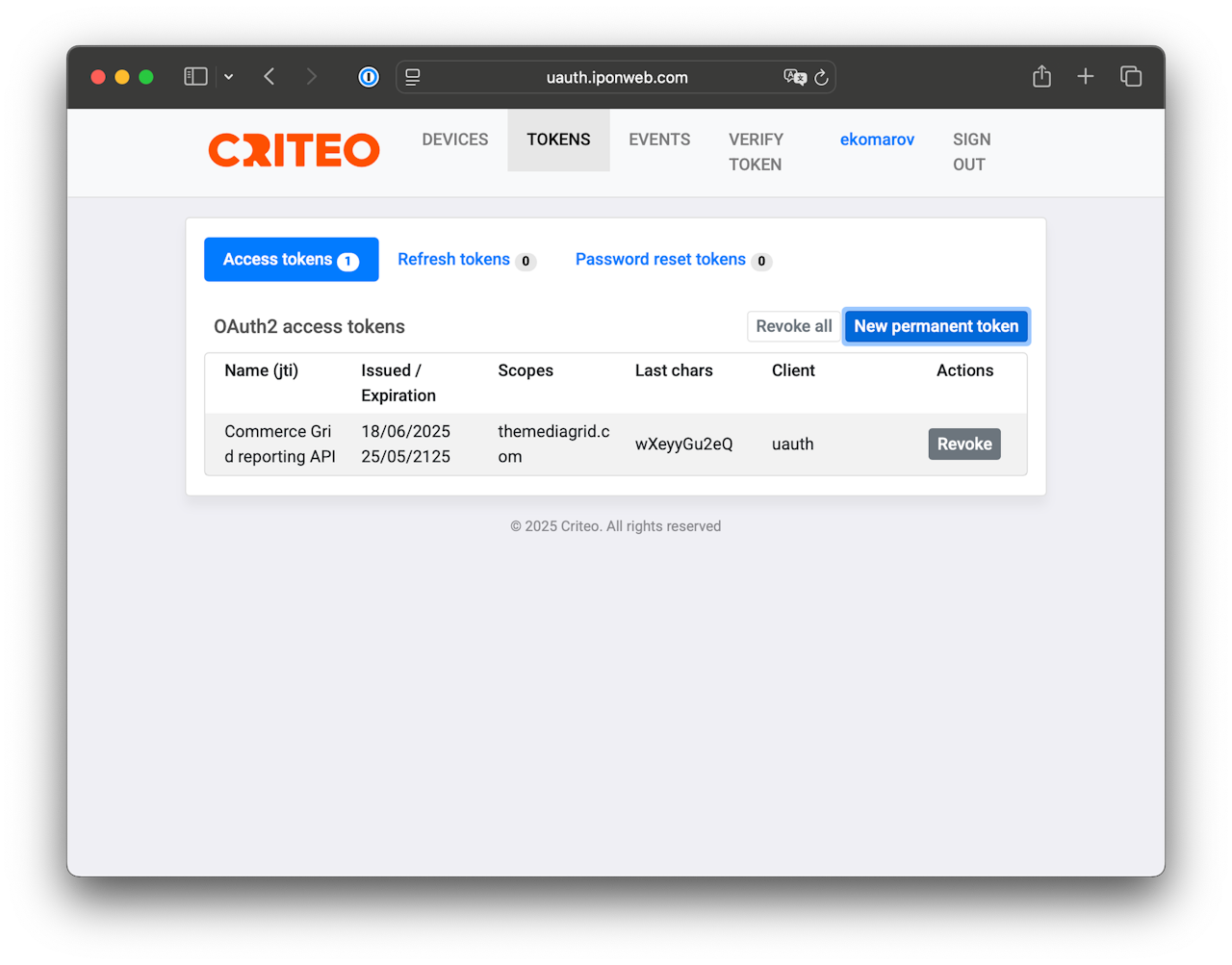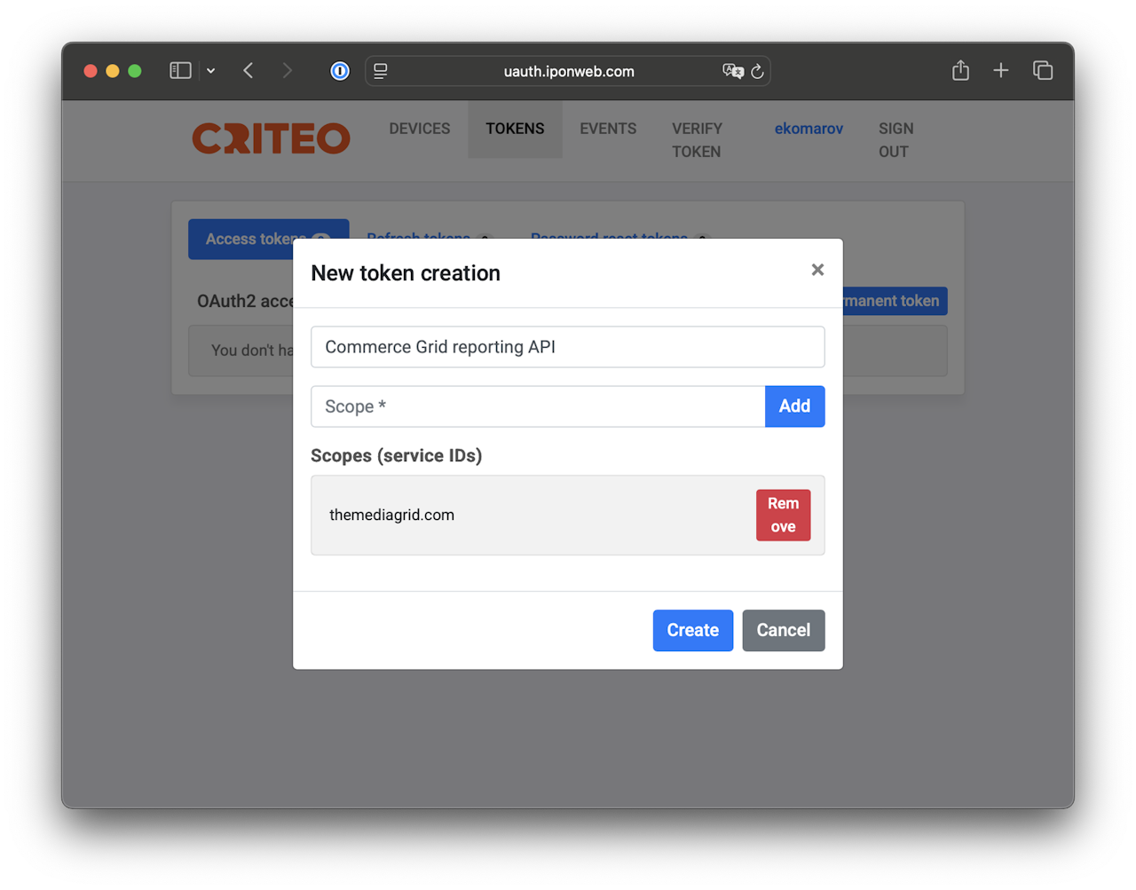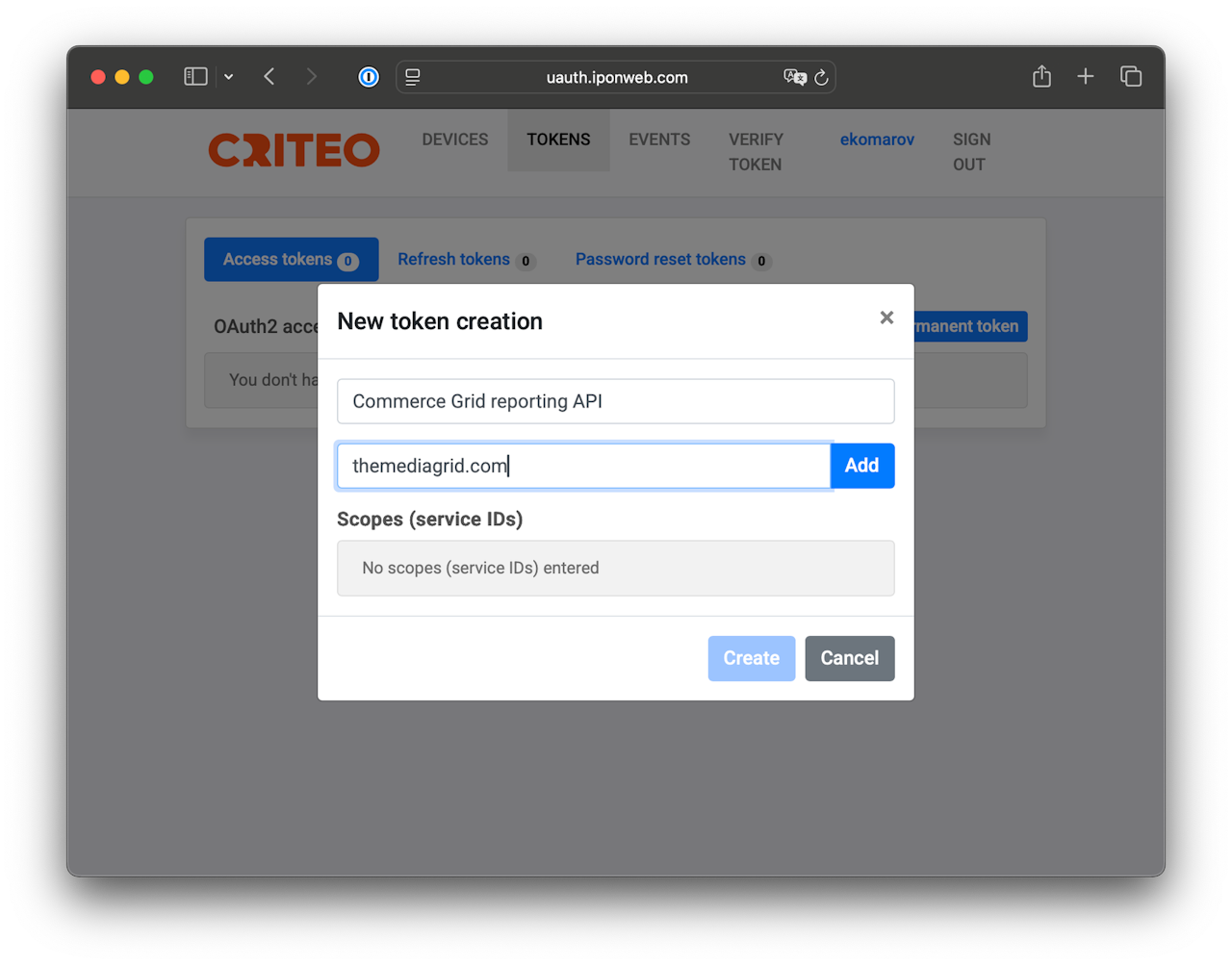 To get a token, first log-in to u-Auth (https://uauth.iponweb.com/uauth/settings/#access) with your Commerce Grid account credentials.