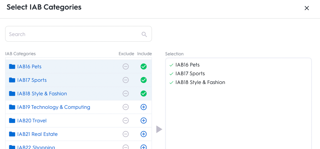 This section allows you to include or exclude IAB content categories to pass in your deal, informing buyers about the nature of your content.