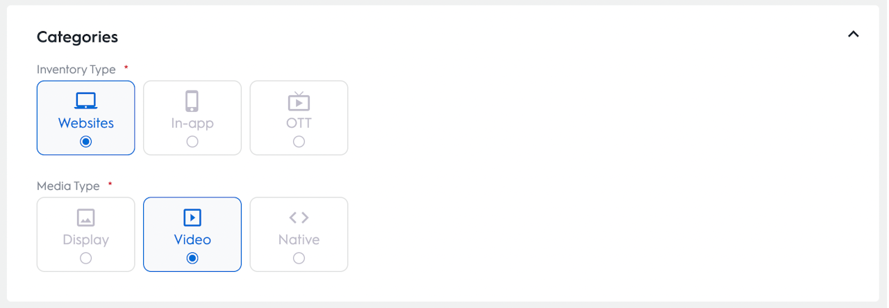 Categories allow you to select your deal's inventory and media types settings.