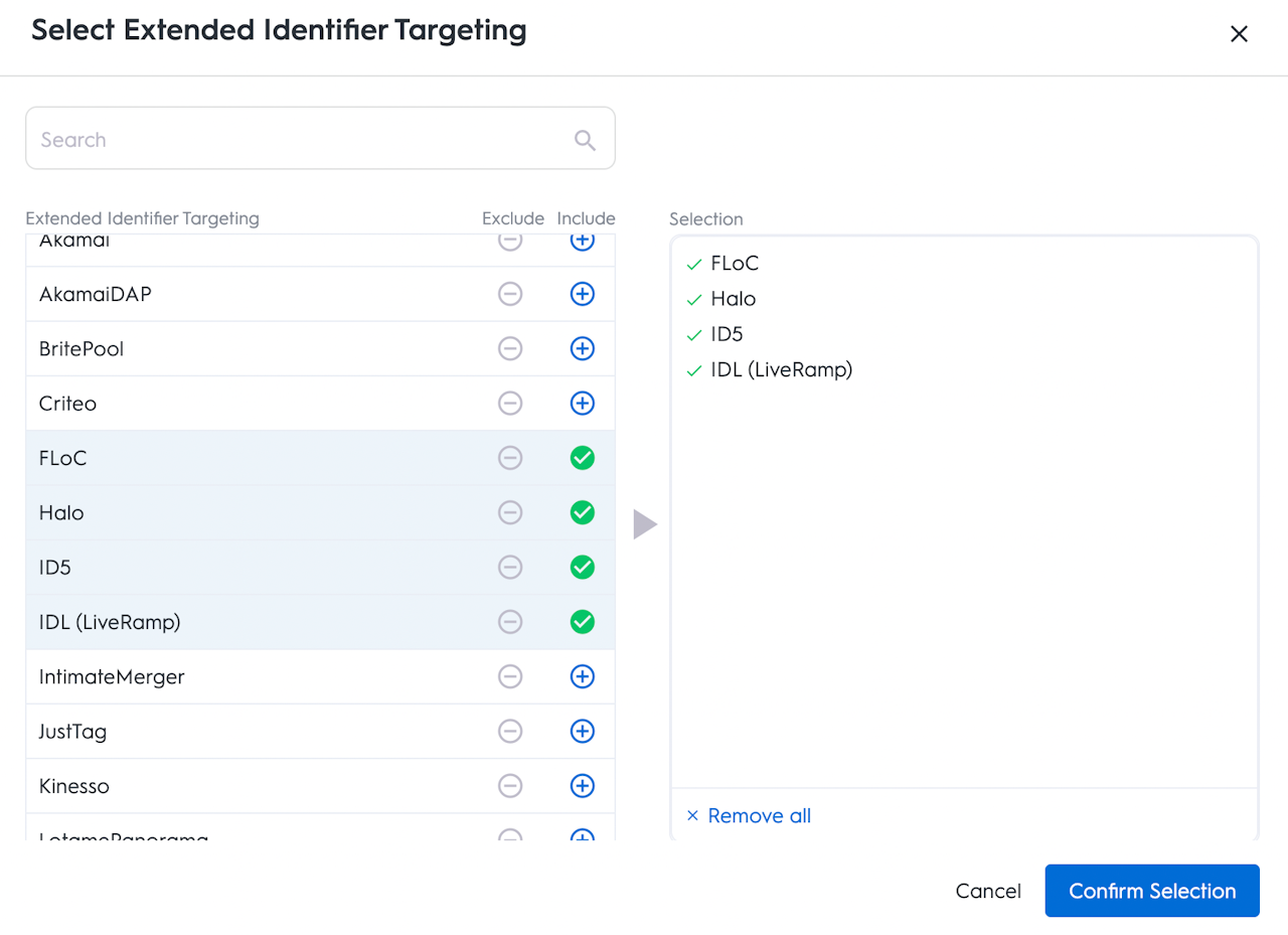 Extended Identifier Targeting: Extended identifier targeting allows you to include or exclude specific cookie namespaces and alternative ID solutions to pass in your deal via the Prebid User ID Module