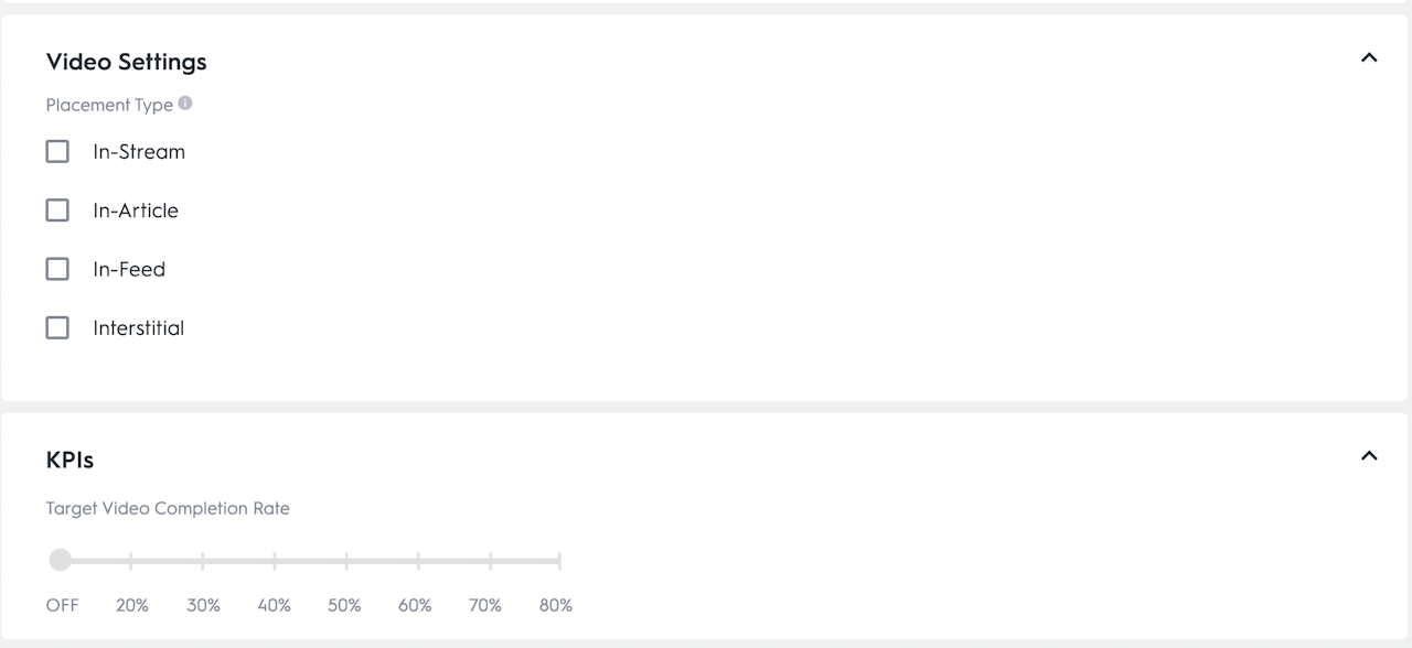 For example, if you’ve selected Video, you’ll see Video Placement Type Targeting and VCR Target as KPI options.