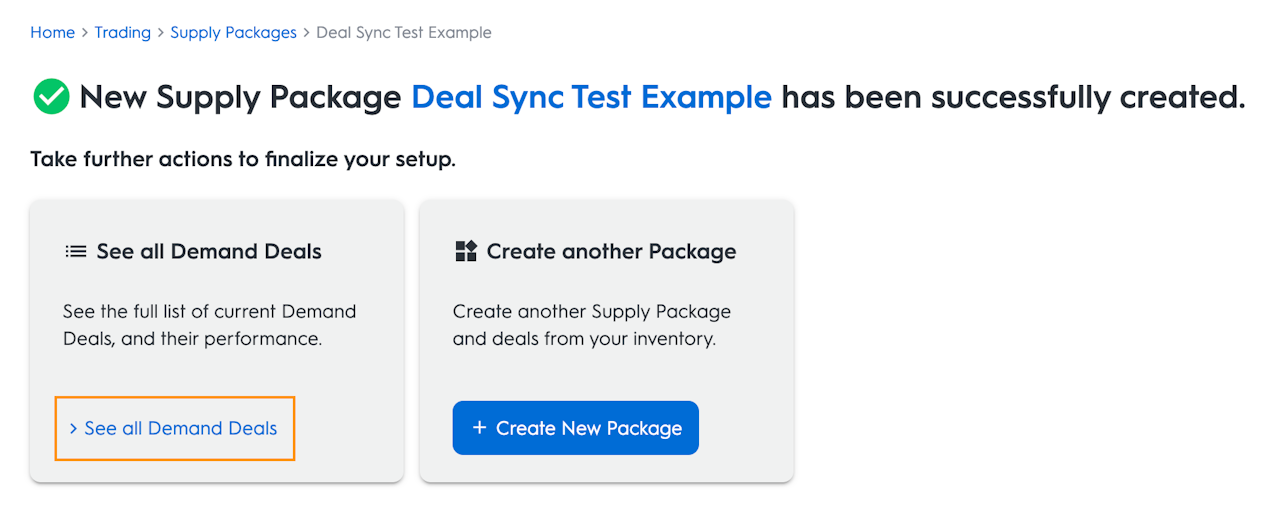 The former will allow you to create an all new package and associated Demand Deal(s), while the latter will allow you to add your new Supply Package to an existing Demand Deal. Even if you have an existing Demand Deal that is Deal Sync enabled, you will be able to add a new Supply Package to it.