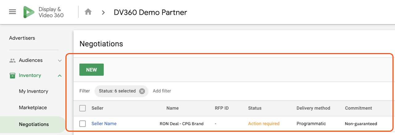 Buyers can find the deal through a few identifying factors in the Negotiations screen of the DV360 UI: