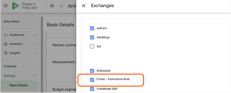 This section explains how to target Commerce Grid (formerly The MediaGrid and Criteo SSP) as an inventory source within the DV360 UI.