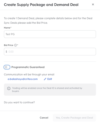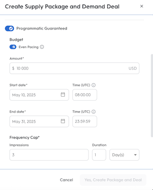 In the Demand Deal creation UI, enable the Programmatic Guaranteed toggle.