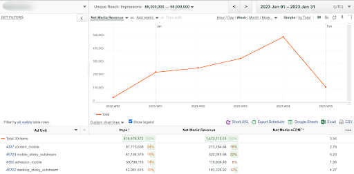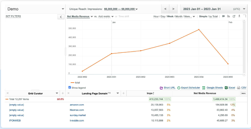 • Metrics: Imps, Net Media Revenue, Net Media eCPM